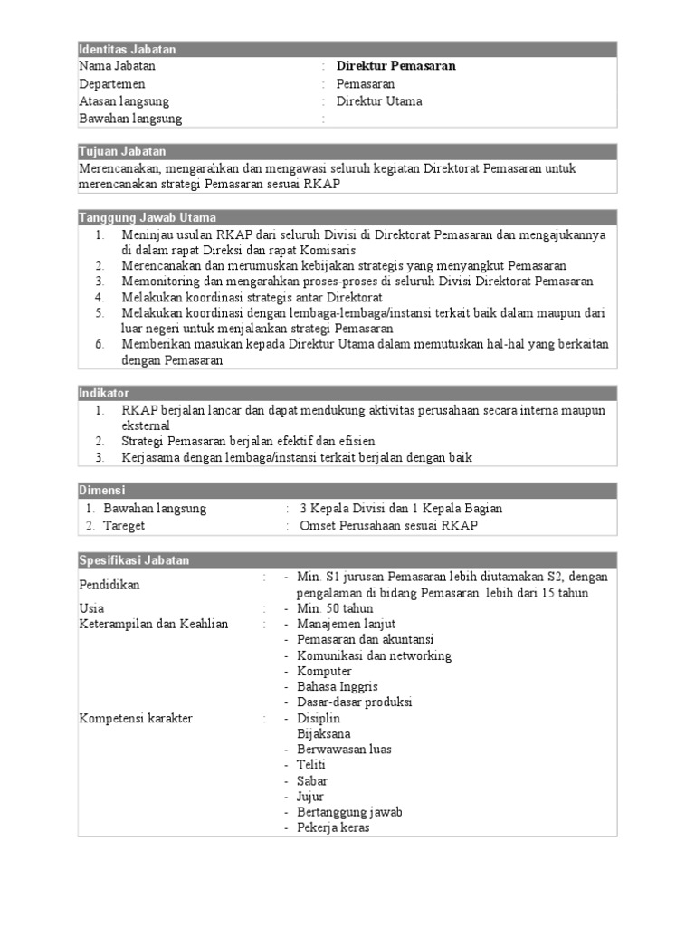 Contoh formulir job analysis contoh o via thefotosgratis.eu. .dokter, contoh job desk, contoh job application letter, contoh job description dalam perusahaan, contoh job description, contoh jobs aid, contoh job report, contoh job sheet, contoh jobdes ppdb. Contoh job description hrd terbaru. Deskripsi pekerjaan untuk tambangdeskripsi lengkap. Sample of simple request letter. Job desk hrd aneka jabatan. Job deskripsi / job description desk collection : More united nations development programme jobs. 43 downloads 662 views 131kb size. Tentu saja tugas mereka berfokus untuk mengatur. .director, contoh job description purchasing executive, contoh job description dalam perusahaan sheet, contoh job desk, contoh job specification, contoh job interview, contoh job safety analysis Sudahkah job description di perusahaan anda dibuat dengan benar ? Berikut detail paket contoh job description hrd yang di tawarkan: